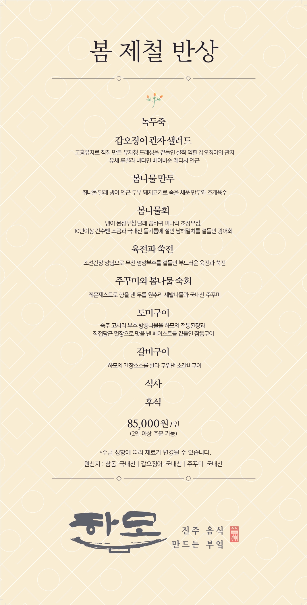 봄제철반상 출시!안녕하세요! 진주음식 만드는 부엌 하모입니다.싱그러운 봄을 맞아 제철 식재료로 준비한 봄제철반상을 출시하게 되었습니다.하모에서 준비한 영양가득한 제철음식 드시고, 봄의 정취를 누리시길 바랍니다.